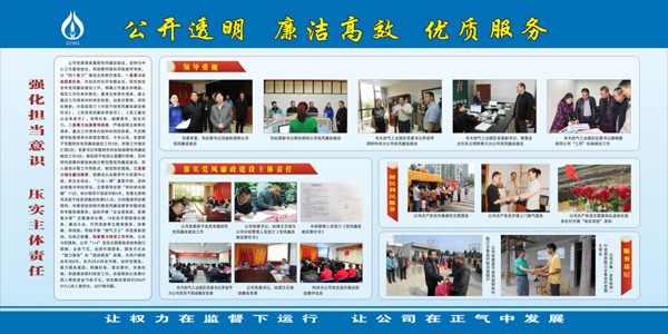 ??? 三、著力強(qiáng)化廉潔教育。把廉潔從業(yè)教育作為黨委中心組、民主生活會(huì)、“三會(huì)一課”重要內(nèi)容,堅(jiān)持會(huì)前集中學(xué)紀(jì)學(xué)法,主要領(lǐng)導(dǎo)會(huì)前“學(xué)紀(jì)講法倡德”11次;舉辦領(lǐng)導(dǎo)干部讀書班4天,黨委主要領(lǐng)導(dǎo)及班子成員講廉政黨課8人次;分別邀請市紀(jì)委領(lǐng)導(dǎo)、市委黨校講師開展黨風(fēng)廉政教育專題講座和專題黨課報(bào)告;組織開展“企業(yè)是我家、發(fā)展靠大家”主題演講比賽,16名選手圍繞強(qiáng)化服務(wù)、廉潔從業(yè)、作風(fēng)效能等主題強(qiáng)服務(wù)、講奉獻(xiàn)、講效能;積極開展“燃?xì)庑l(wèi)士”評選表彰活動(dòng),弘揚(yáng)正能量。