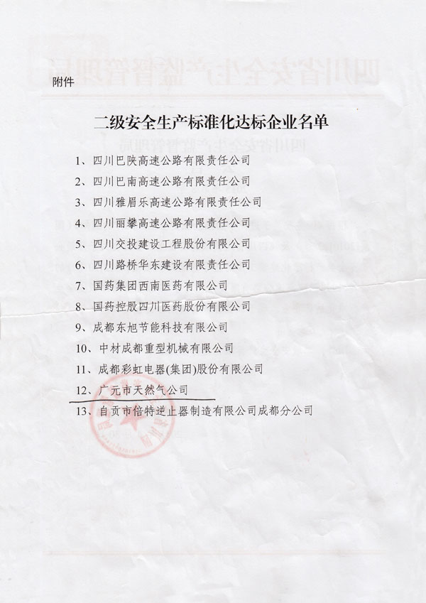 ??? 2015年4月30日廣元市天然氣公司被四川省安全生產監(jiān)督管理局公告(2015年第8號)為二級安全生產標準化達標企業(yè)。