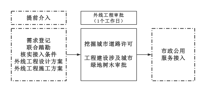 堅持以優(yōu)化市政公用接入服務體系為目標,以政府數(shù)字化轉型為支撐,堅持需求導向、問題導向、效果導向,通過進一步壓縮時限、降低成本、減少環(huán)節(jié)、簡化審批,對水電氣信外線工程審批事項再梳理、流程再優(yōu)化,切實提高外線工程審批效率和服務水平,實現(xiàn)審批申請材料精簡至1套、審批環(huán)節(jié)合并為1項、審批時限控制在1個工作日的總體目標。